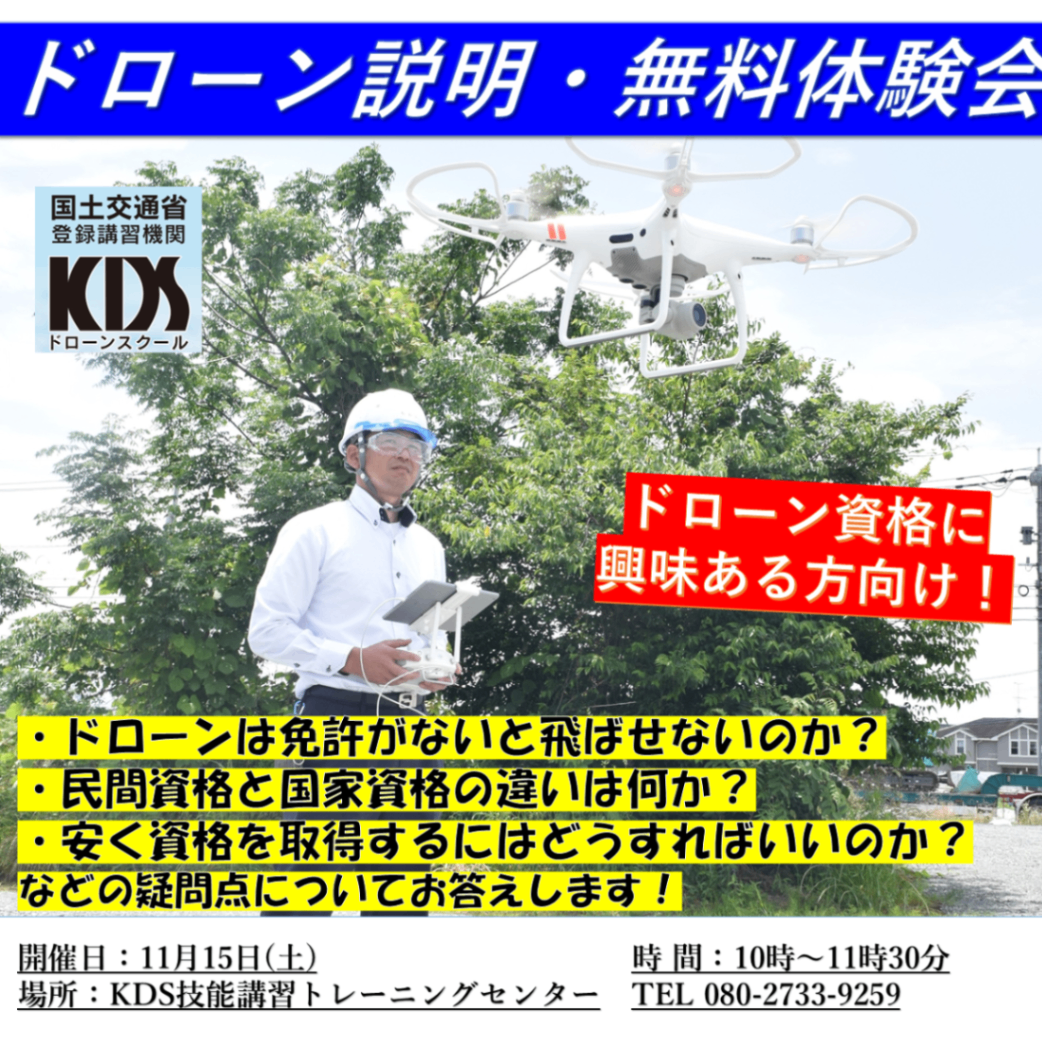 ドローンに興味はある方必見! 実際にドローンを操縦していただく、体験会を実施いたします! 免許がないと飛ばせないのか?民間資格と国家資格の違い、安く資格を取得するにはなども説明いたします。 開催日:11月15日(土) 時 間:10時~11時30分 場 所:KDS技能講習トレーニングセンター(菊池市広瀬641-3) 定 員:各時間2名まで 申し込みは下記URLの予約フォームから、又はお電話にて受付中! https://ws.formzu.net/dist/S357632660/ 皆様のご参加お待ちしております。